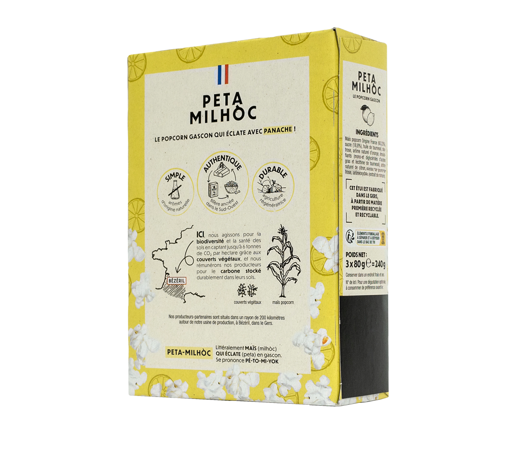 Maïs à popcorn Origine France (60,23%), sucre (18,8%), huile de tournesol, dextrose, arôme naturel d’orange, émulsifiants (mono-et diglycérides d’acides gras et lécithine de tournesol), arôme naturel de citron, antioxydant (extrait de romarin).